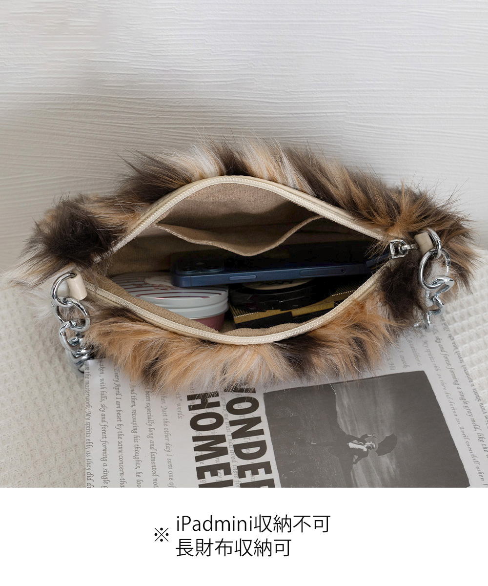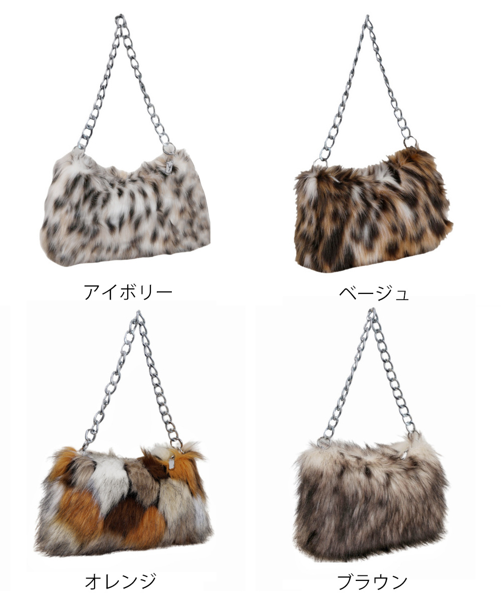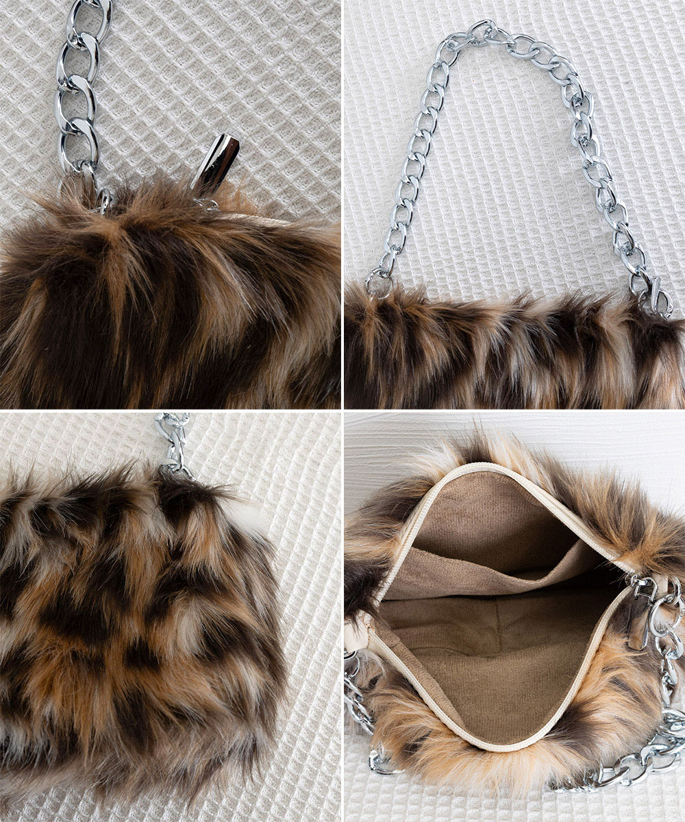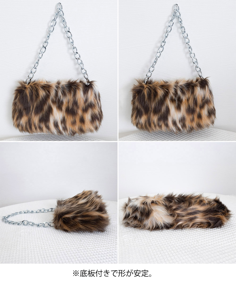 ボリュームフェイクファー チェーン肩掛けバッグ レディース おしゃれ手提げカバン レオパード柄 ふわふわ鞄 ハンドバッグ エコファー バッグ 2WAY ヒョウ柄 モコモコバッグ軽量 カラーファーが目を惹くチェーンショルダーバッグ。 やわらかな触り心地のエコーファー素材で、持つだけで季節感と華やかさをプラス。 コンパクトなサイズ感ながら、必需品がしっかり入るちょうど良い容量。 底板付きで荷物を入れても型崩れしにくい。 デイリー使いはもちろん、ちょっとしたお出かけや夜の食事会・イベントなど、幅広いシーンで活躍。 素材:ポリエステル カラー:アイボリー/ベージュ/オレンジ/ブラウン サイズ: 高さ:約15cm 上横幅:約25cm 底横幅:約26cm マチ:約7.5cm 持ち手高さ:約22cm 持ち手長さ:約52cm(調節不可、取り外し不可) ■収納について ・A4対応(22×31cm):× ・iPadmini対応(19.6×13.5×0.7cm):× ・長財布(10×20cm):〇 ・二つ折り財布:〇 ・キーケース:〇 ・ペットボトル横向き(500ml):× ・ペットボトル縦向き(500ml):× 重さ:約188g 裏地:あり 内ポケット:あり 生産国:中国 ※すべて平置きサイズです(採寸方法違いより、多少の誤差がございますので、ご了承ください)。 ※海外輸入品のため、商品の細部仕様は多少異なる場合がございます。予めご了承の上、ご注文お願い致します。