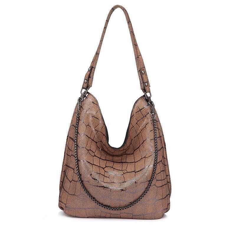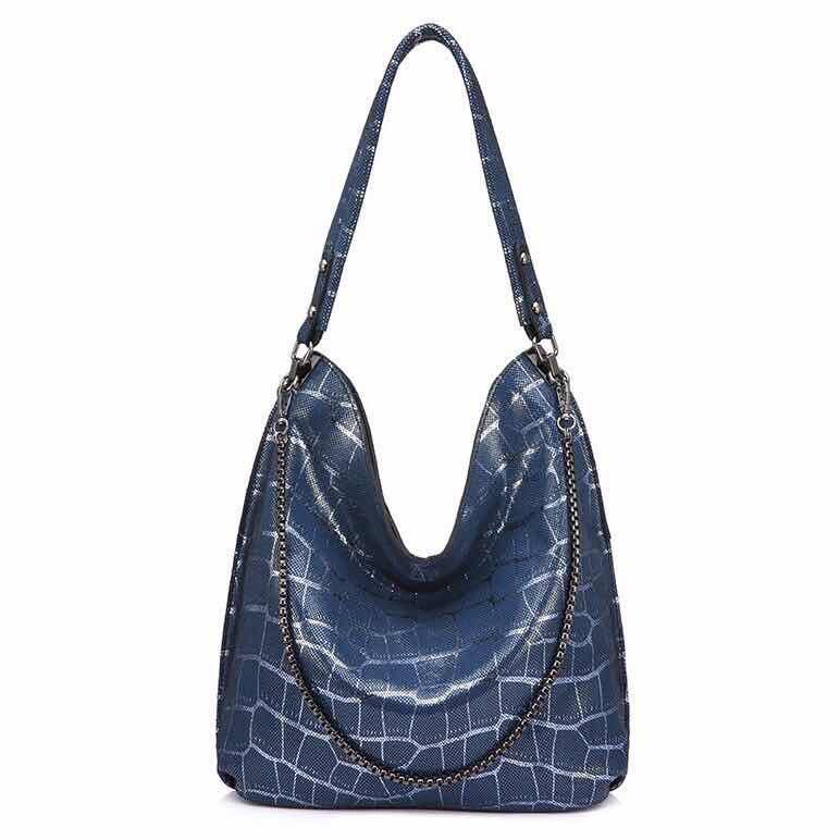 洗練されたデザインが魅力のチェーン バッグです。 型押し加工を施した上質な素材に金属製のチェーンを配置し、エレガントな雰囲気を演出します。 トートタイプの実用的な構造で、日常使いから特別な日まで幅広く活躍します。 柔らかなフォルムと光沢感のある質感が大人の女性らしさを引き立てる逸品です。 収納力も十分で、荷物の多い日でも安心してお使いいただけます。