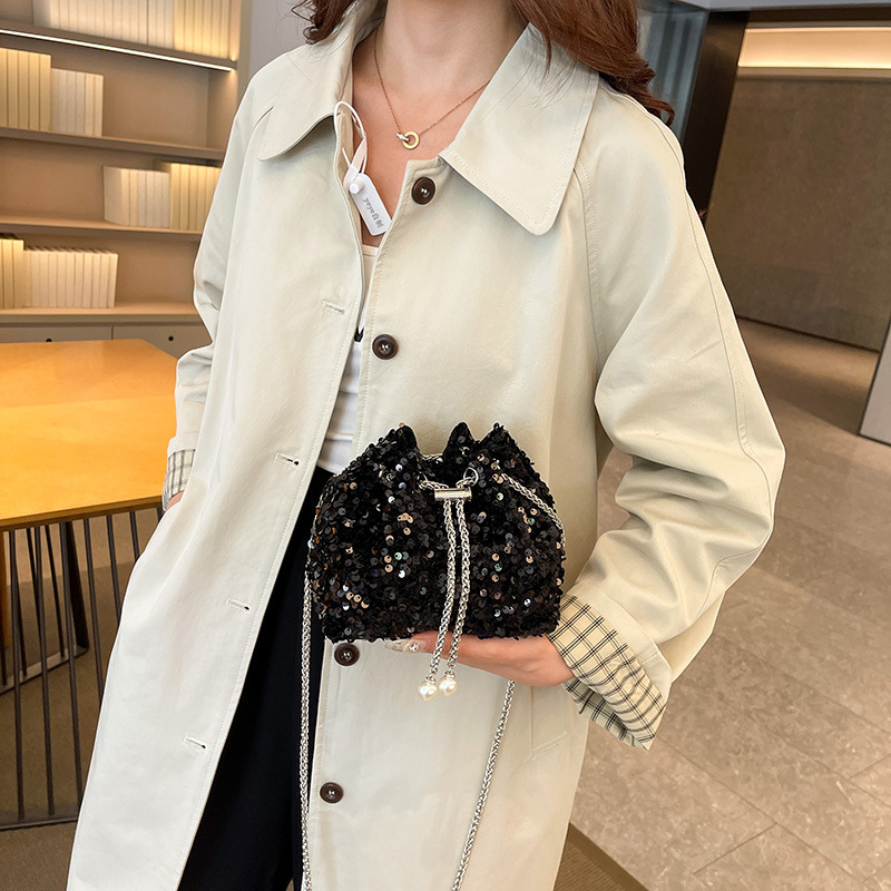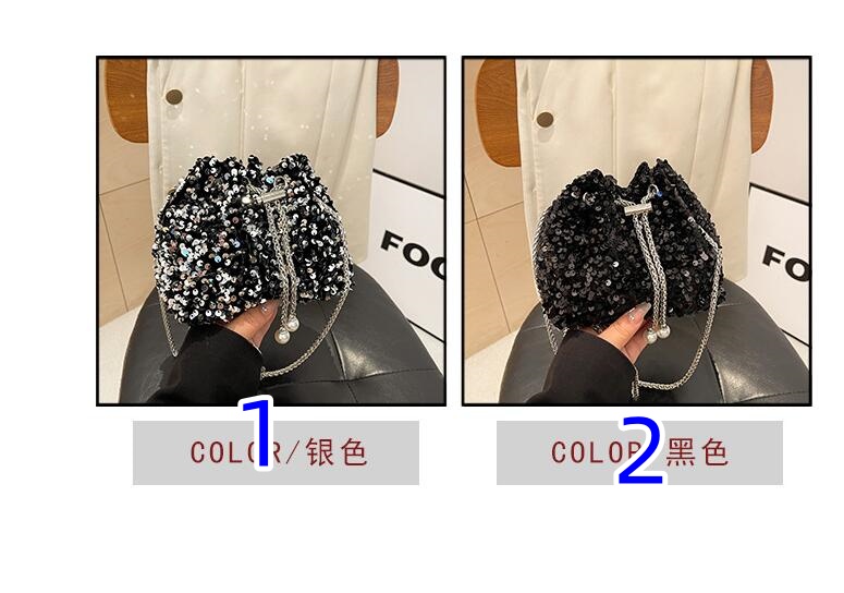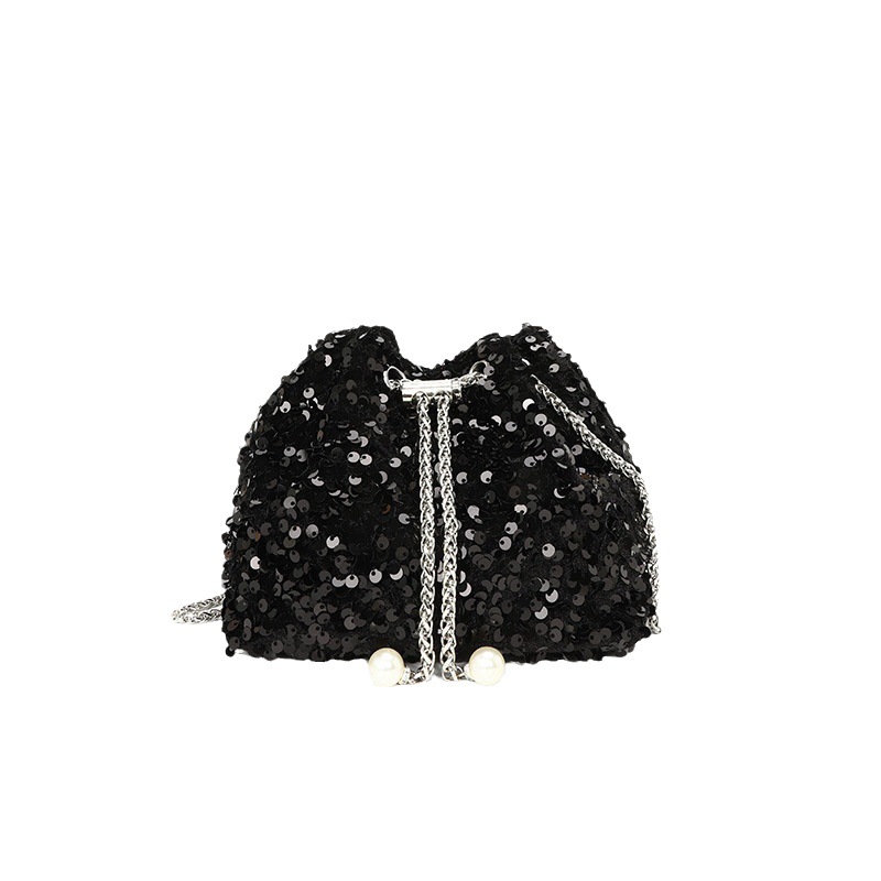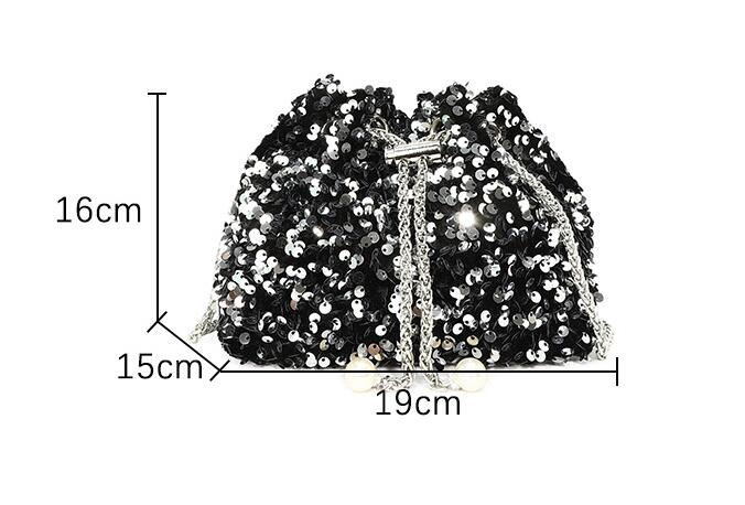 華やかなスパンコールが輝く巾着型のチェーンバッグ。