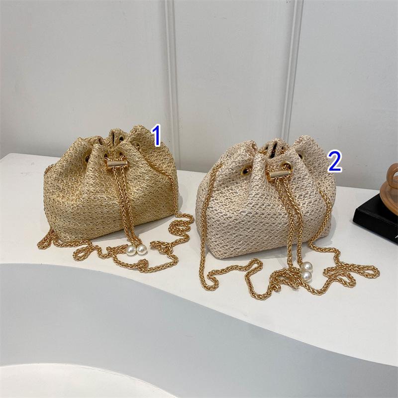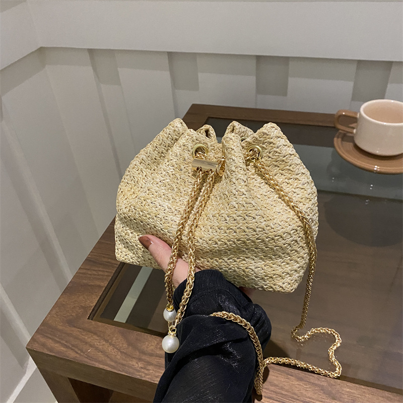 上品な草編み素材の巾着型ミニバッグです。
